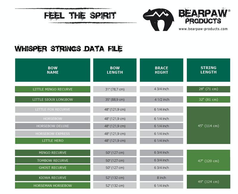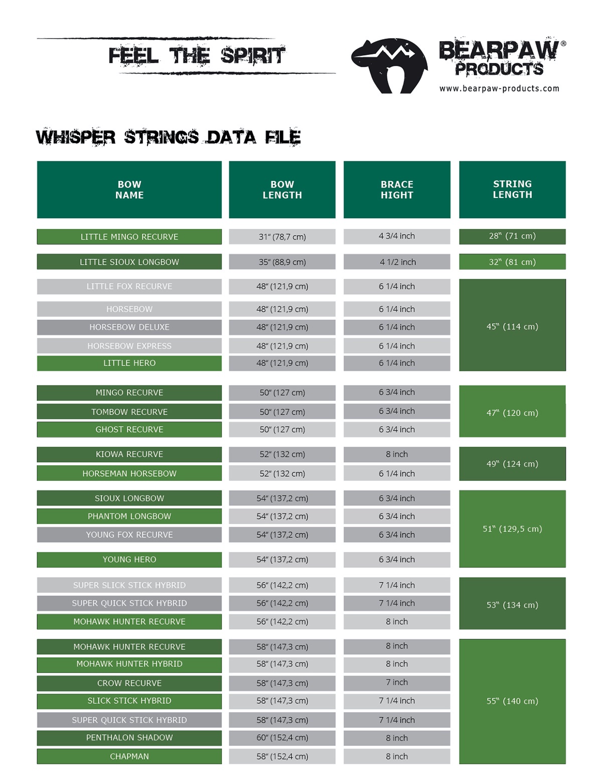Die Länge bei den Fertigsehnen bezeichnet die AMO-Länge des Bogens! Wenn Sie also einen 68" Bogen haben, bestellen Sie bitte eine 68" Sehne, sie hat dann die richtige Länge.
