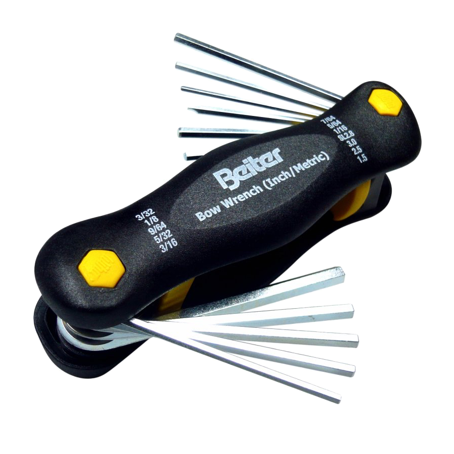 Der Beiter Bow Wrench beinhaltet 8 Inbusschlüssel in Zoll, 3 metrische Inbusschlüssel und eine Klinge mit Schlitz 2,8.