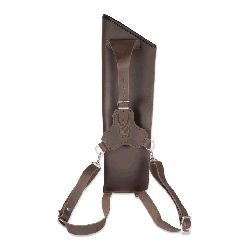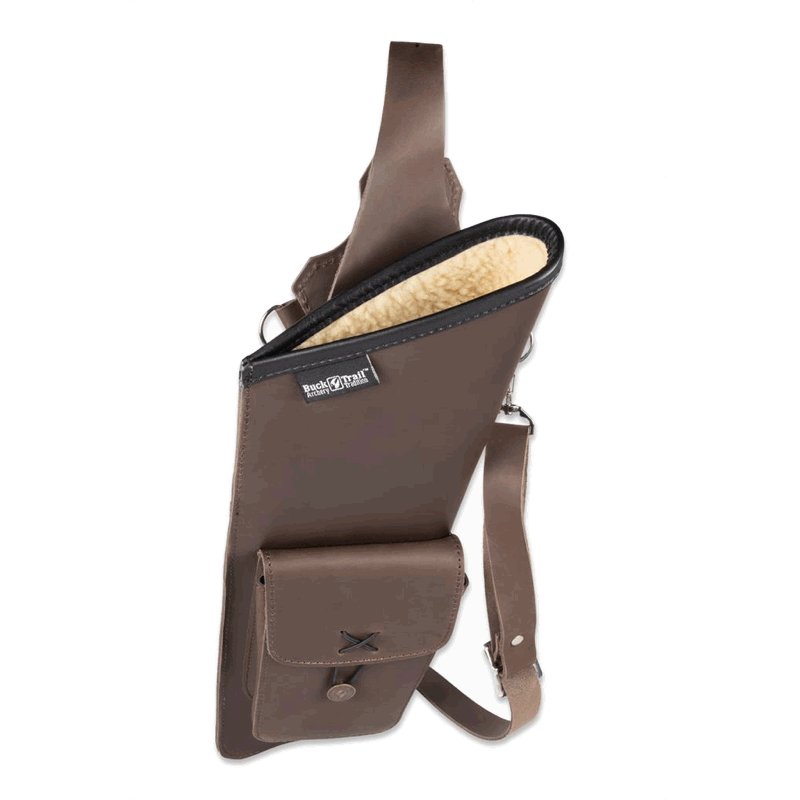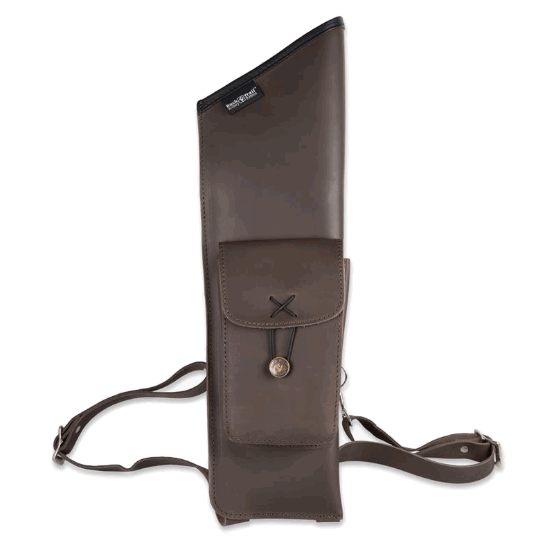 Elegant back quiver made of leather, with front pocket and adjustable straps. Available for LH and RH shooters.