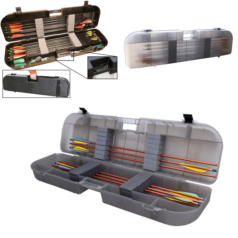 Hochwertige MTM Pfeilbox aus robustem Kunsstoff. Sie bietet extra 4 kleine Abteile für zusätzlichen Stauraum von Kleinzubehörteilen. Die Pfeile können sicher in fixierten Schaumstoffhalterungen transportiert werden.